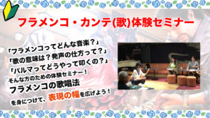 「フラメンコ=コミュニケーション」をテーマに、フラメンコの代表的な曲種1つを取り上げて、パルマ(手拍子)を叩いて、歌って、弾いて、踊って、最後はその場にいる人達と合わせるという内容でお届けしています。