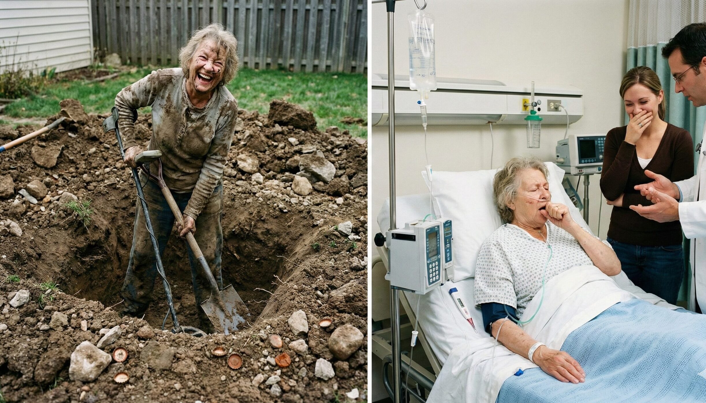 日本語訳: 「ウチの姑、宝探しに夢中で地面掘り返してたけど… 金貨を見つける代わりに、肺炎にかかりやがった(笑)」