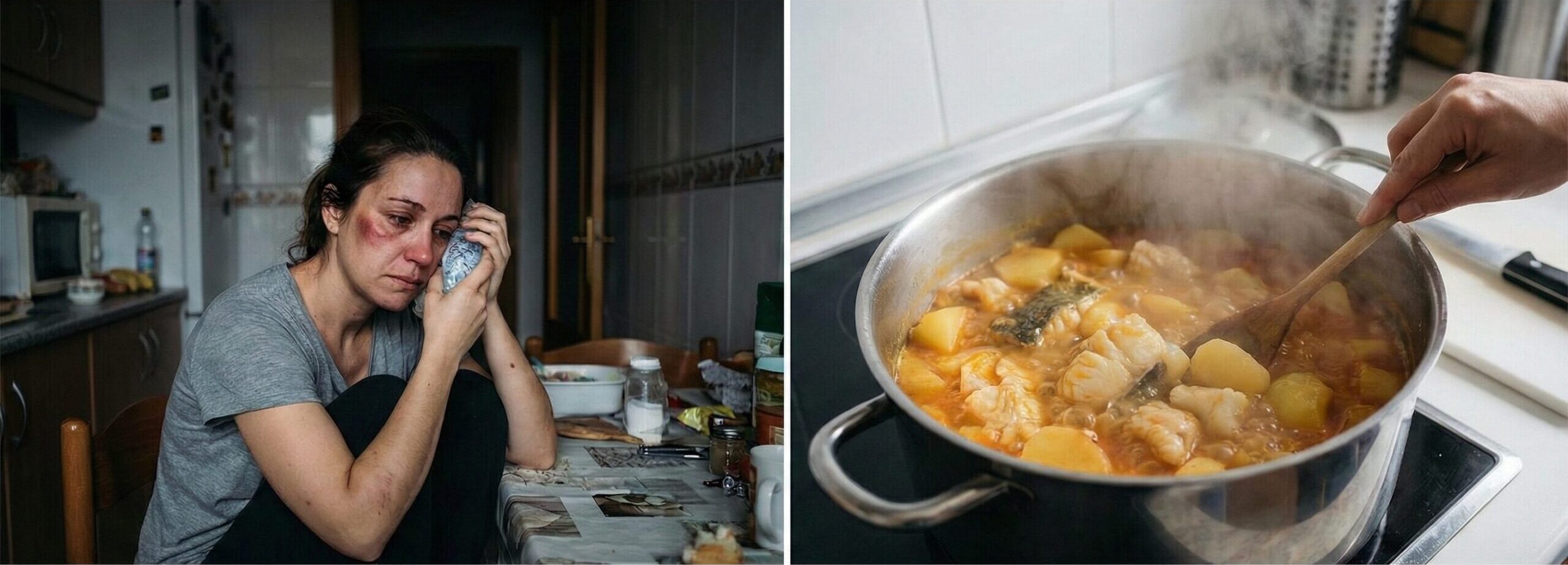 日本語訳: 「旦那に殴られたわ / 鱈(タラ)とジャガイモの煮込みを作れって言うから」